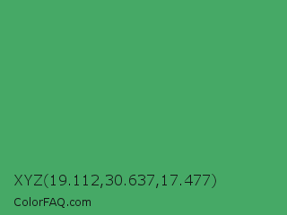 XYZ 19.112,30.637,17.477 Color is a normal green color and the nearest color is Chateau Green #40a860. Hex code #46a966 and RGB value is rgb(70,169,102). In RGB color space, this color is composed of 27% red, 66% green, 40% blue, In CMYK color space, this color is composed of 59% cyan, 0% magenta, 40% yellow , 34% black , In HSL color space, this color has a hue angle of 139° , 41% saturation and 47% lightness.
