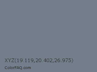 XYZ 19.119,20.402,26.975 Color is a normal blue color and the nearest color is Raven #727b89. Hex code #737e8a and RGB value is rgb(115,126,138). In RGB color space, this color is composed of 45% red, 49% green, 54% blue, In CMYK color space, this color is composed of 17% cyan, 9% magenta, 0% yellow , 46% black , In HSL color space, this color has a hue angle of 211° , 9% saturation and 50% lightness.
