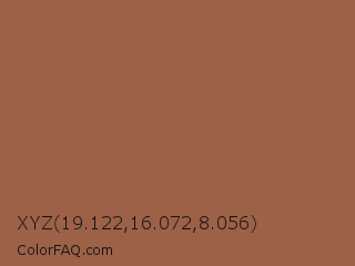 XYZ 19.122,16.072,8.056 Color is a normal orange color and the nearest color is Cape Palliser #a26645. Hex code #9c6147 and RGB value is rgb(156,97,71). In RGB color space, this color is composed of 61% red, 38% green, 28% blue, In CMYK color space, this color is composed of 0% cyan, 38% magenta, 54% yellow , 39% black , In HSL color space, this color has a hue angle of 18° , 37% saturation and 45% lightness.