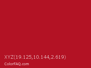 XYZ 19.125,10.144,2.619 Color is a normal red color and the nearest color is Carnelian #b31b1b. Hex code #b31224 and RGB value is rgb(179,18,36). In RGB color space, this color is composed of 70% red, 7% green, 14% blue, In CMYK color space, this color is composed of 0% cyan, 90% magenta, 80% yellow , 30% black , In HSL color space, this color has a hue angle of 353° , 82% saturation and 39% lightness.