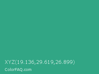 XYZ 19.136,29.619,26.899 Color is a normal green color and the nearest color is Jungle Green #29ab87. Hex code #31a685 and RGB value is rgb(49,166,133). In RGB color space, this color is composed of 19% red, 65% green, 52% blue, In CMYK color space, this color is composed of 70% cyan, 0% magenta, 20% yellow , 35% black , In HSL color space, this color has a hue angle of 163° , 54% saturation and 42% lightness.