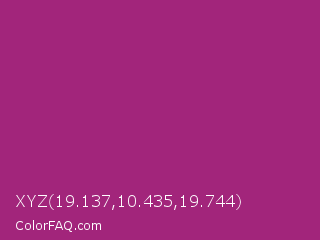XYZ 19.137,10.435,19.744 Color is a normal magenta color and the nearest color is Royal Heath #ab3472. Hex code #a2257b and RGB value is rgb(162,37,123). In RGB color space, this color is composed of 64% red, 15% green, 48% blue, In CMYK color space, this color is composed of 0% cyan, 77% magenta, 24% yellow , 36% black , In HSL color space, this color has a hue angle of 319° , 63% saturation and 39% lightness.