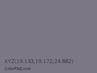 XYZ 19.143,19.172,24.882 Color is a normal violet color and the nearest color is Topaz #7c778a. Hex code #7c7785 and RGB value is rgb(124,119,133). In RGB color space, this color is composed of 49% red, 47% green, 52% blue, In CMYK color space, this color is composed of 7% cyan, 11% magenta, 0% yellow , 48% black , In HSL color space, this color has a hue angle of 261° , 6% saturation and 49% lightness.