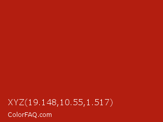 XYZ 19.148,10.55,1.517 Color is a normal red color and the nearest color is International Orange Engineering #ba160c. Hex code #b31e10 and RGB value is rgb(179,30,16). In RGB color space, this color is composed of 70% red, 12% green, 6% blue, In CMYK color space, this color is composed of 0% cyan, 83% magenta, 91% yellow , 30% black , In HSL color space, this color has a hue angle of 5° , 84% saturation and 38% lightness.
