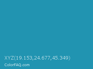 XYZ 19.153,24.677,45.349 Color is a normal cyan color and the nearest color is Eastern Blue #1e9ab0. Hex code #2194b1 and RGB value is rgb(33,148,177). In RGB color space, this color is composed of 13% red, 58% green, 69% blue, In CMYK color space, this color is composed of 81% cyan, 16% magenta, 0% yellow , 31% black , In HSL color space, this color has a hue angle of 192° , 69% saturation and 41% lightness.