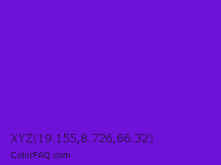 XYZ 19.155,8.726,66.32 Color is a normal violet color and the nearest color is French Violet #8806ce. Hex code #6e11d9 and RGB value is rgb(110,17,217). In RGB color space, this color is composed of 43% red, 7% green, 85% blue, In CMYK color space, this color is composed of 49% cyan, 92% magenta, 0% yellow , 15% black , In HSL color space, this color has a hue angle of 268° , 85% saturation and 46% lightness.