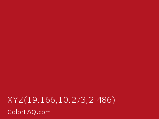 XYZ 19.166,10.273,2.486 Color is a normal red color and the nearest color is Carnelian #b31b1b. Hex code #b31622 and RGB value is rgb(179,22,34). In RGB color space, this color is composed of 70% red, 9% green, 13% blue, In CMYK color space, this color is composed of 0% cyan, 88% magenta, 81% yellow , 30% black , In HSL color space, this color has a hue angle of 355° , 78% saturation and 39% lightness.
