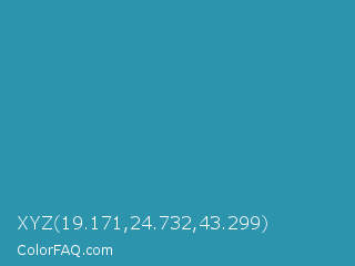 XYZ 19.171,24.732,43.299 Color is a normal cyan color and the nearest color is Eastern Blue #1e9ab0. Hex code #2c94ad and RGB value is rgb(44,148,173). In RGB color space, this color is composed of 17% red, 58% green, 68% blue, In CMYK color space, this color is composed of 75% cyan, 14% magenta, 0% yellow , 32% black , In HSL color space, this color has a hue angle of 192° , 59% saturation and 43% lightness.