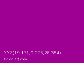 XYZ 19.171,9.275,28.384 Color is a normal magenta color and the nearest color is Violet Eggplant #991199. Hex code #9d0093 and RGB value is rgb(157,0,147). In RGB color space, this color is composed of 62% red, 0% green, 58% blue, In CMYK color space, this color is composed of 0% cyan, 100% magenta, 6% yellow , 38% black , In HSL color space, this color has a hue angle of 304° , 100% saturation and 31% lightness.