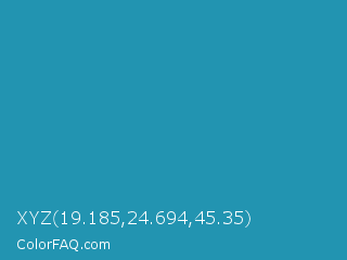 XYZ 19.185,24.694,45.35 Color is a normal cyan color and the nearest color is Eastern Blue #1e9ab0. Hex code #2294b1 and RGB value is rgb(34,148,177). In RGB color space, this color is composed of 13% red, 58% green, 69% blue, In CMYK color space, this color is composed of 81% cyan, 16% magenta, 0% yellow , 31% black , In HSL color space, this color has a hue angle of 192° , 68% saturation and 41% lightness.