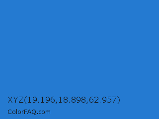 XYZ 19.196,18.898,62.957 Color is a normal blue color and the nearest color is Bright Navy Blue #1974d2. Hex code #247ad1 and RGB value is rgb(36,122,209). In RGB color space, this color is composed of 14% red, 48% green, 82% blue, In CMYK color space, this color is composed of 83% cyan, 42% magenta, 0% yellow , 18% black , In HSL color space, this color has a hue angle of 210° , 71% saturation and 48% lightness.