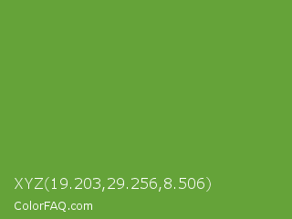 XYZ 19.203,29.256,8.506 Color is a normal green color and the nearest color is Green RYB #66b032. Hex code #65a339 and RGB value is rgb(101,163,57). In RGB color space, this color is composed of 40% red, 64% green, 22% blue, In CMYK color space, this color is composed of 38% cyan, 0% magenta, 65% yellow , 36% black , In HSL color space, this color has a hue angle of 95° , 48% saturation and 43% lightness.