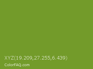 XYZ 19.209,27.255,6.439 Color is a normal green color and the nearest color is Olive Drab #6b8e23. Hex code #739b2a and RGB value is rgb(115,155,42). In RGB color space, this color is composed of 45% red, 61% green, 16% blue, In CMYK color space, this color is composed of 26% cyan, 0% magenta, 73% yellow , 39% black , In HSL color space, this color has a hue angle of 81° , 57% saturation and 39% lightness.