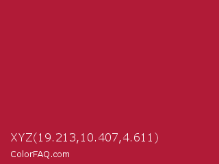 XYZ 19.213,10.407,4.611 Color is a normal red color and the nearest color is Deep Carmine #a9203e. Hex code #b11b37 and RGB value is rgb(177,27,55). In RGB color space, this color is composed of 69% red, 11% green, 22% blue, In CMYK color space, this color is composed of 0% cyan, 85% magenta, 69% yellow , 31% black , In HSL color space, this color has a hue angle of 349° , 74% saturation and 40% lightness.