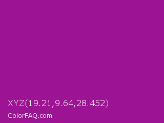 XYZ 19.21,9.64,28.452 Color is a normal magenta color and the nearest color is Violet Eggplant #991199. Hex code #9c1393 and RGB value is rgb(156,19,147). In RGB color space, this color is composed of 61% red, 7% green, 58% blue, In CMYK color space, this color is composed of 0% cyan, 88% magenta, 6% yellow , 39% black , In HSL color space, this color has a hue angle of 304° , 78% saturation and 34% lightness.