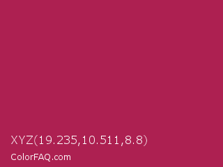XYZ 19.235,10.511,8.8 Color is a normal rose color and the nearest color is Amaranth Purple #ab274f. Hex code #ad2051 and RGB value is rgb(173,32,81). In RGB color space, this color is composed of 68% red, 13% green, 32% blue, In CMYK color space, this color is composed of 0% cyan, 82% magenta, 53% yellow , 32% black , In HSL color space, this color has a hue angle of 339° , 69% saturation and 40% lightness.