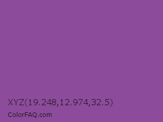 XYZ 19.248,12.974,32.5 Color is a normal purple color and the nearest color is Razzmic Berry #8d4e85. Hex code #8c4b9b and RGB value is rgb(140,75,155). In RGB color space, this color is composed of 55% red, 29% green, 61% blue, In CMYK color space, this color is composed of 10% cyan, 52% magenta, 0% yellow , 39% black , In HSL color space, this color has a hue angle of 289° , 35% saturation and 45% lightness.