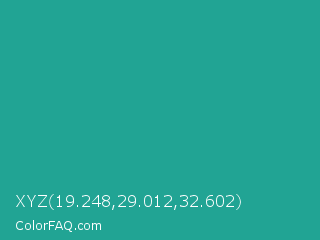 XYZ 19.248,29.012,32.602 Color is a normal cyan color and the nearest color is Jungle Green #29ab87. Hex code #21a494 and RGB value is rgb(33,164,148). In RGB color space, this color is composed of 13% red, 64% green, 58% blue, In CMYK color space, this color is composed of 80% cyan, 0% magenta, 10% yellow , 36% black , In HSL color space, this color has a hue angle of 173° , 66% saturation and 39% lightness.