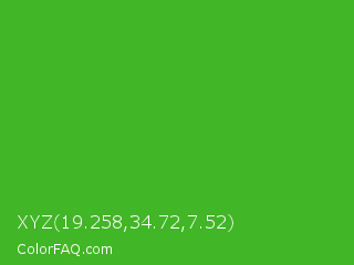 XYZ 19.258,34.72,7.52 Color is a normal green color and the nearest color is Wageningen Green #34b233. Hex code #41b626 and RGB value is rgb(65,182,38). In RGB color space, this color is composed of 25% red, 71% green, 15% blue, In CMYK color space, this color is composed of 64% cyan, 0% magenta, 79% yellow , 29% black , In HSL color space, this color has a hue angle of 109° , 65% saturation and 43% lightness.