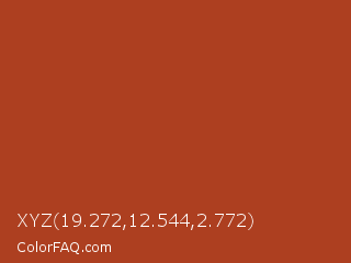 XYZ 19.272,12.544,2.772 Color is a normal red color and the nearest color is Chinese Red #aa381e. Hex code #ad3f20 and RGB value is rgb(173,63,32). In RGB color space, this color is composed of 68% red, 25% green, 13% blue, In CMYK color space, this color is composed of 0% cyan, 64% magenta, 82% yellow , 32% black , In HSL color space, this color has a hue angle of 13° , 69% saturation and 40% lightness.