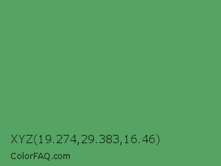 XYZ 19.274,29.383,16.46 Color is a normal green color and the nearest color is Fruit Salad #4f9d5d. Hex code #55a463 and RGB value is rgb(85,164,99). In RGB color space, this color is composed of 33% red, 64% green, 39% blue, In CMYK color space, this color is composed of 48% cyan, 0% magenta, 40% yellow , 36% black , In HSL color space, this color has a hue angle of 131° , 32% saturation and 49% lightness.