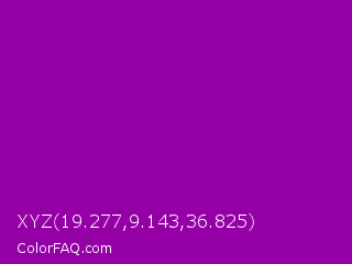 XYZ 19.277,9.143,36.825 Color is a normal magenta color and the nearest color is Violet RYB #8601af. Hex code #9500a6 and RGB value is rgb(149,0,166). In RGB color space, this color is composed of 58% red, 0% green, 65% blue, In CMYK color space, this color is composed of 10% cyan, 100% magenta, 0% yellow , 35% black , In HSL color space, this color has a hue angle of 294° , 100% saturation and 33% lightness.
