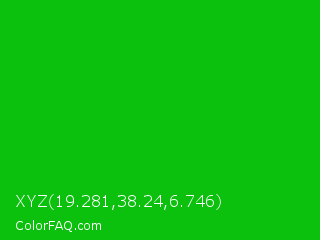 XYZ 19.281,38.24,6.746 Color is a normal green color and the nearest color is Vivid Malachite #00cc33. Hex code #0bc10d and RGB value is rgb(11,193,13). In RGB color space, this color is composed of 4% red, 76% green, 5% blue, In CMYK color space, this color is composed of 94% cyan, 0% magenta, 93% yellow , 24% black , In HSL color space, this color has a hue angle of 121° , 89% saturation and 40% lightness.