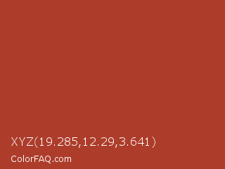 XYZ 19.285,12.29,3.641 Color is a normal red color and the nearest color is Sweet Brown #a83731. Hex code #ad3c2b and RGB value is rgb(173,60,43). In RGB color space, this color is composed of 68% red, 24% green, 17% blue, In CMYK color space, this color is composed of 0% cyan, 65% magenta, 75% yellow , 32% black , In HSL color space, this color has a hue angle of 8° , 60% saturation and 42% lightness.