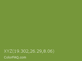 XYZ 19.302,26.29,8.06 Color is a normal green color and the nearest color is Palm Leaf #6f9940. Hex code #76973a and RGB value is rgb(118,151,58). In RGB color space, this color is composed of 46% red, 59% green, 23% blue, In CMYK color space, this color is composed of 22% cyan, 0% magenta, 62% yellow , 41% black , In HSL color space, this color has a hue angle of 81° , 44% saturation and 41% lightness.