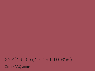 XYZ 19.316,13.694,10.858 Color is a normal red color and the nearest color is Middle Red Purple #a55353. Hex code #a24d58 and RGB value is rgb(162,77,88). In RGB color space, this color is composed of 64% red, 30% green, 35% blue, In CMYK color space, this color is composed of 0% cyan, 52% magenta, 46% yellow , 36% black , In HSL color space, this color has a hue angle of 352° , 36% saturation and 47% lightness.