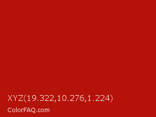 XYZ 19.322,10.276,1.224 Color is a normal red color and the nearest color is Milano Red #b81104. Hex code #b51209 and RGB value is rgb(181,18,9). In RGB color space, this color is composed of 71% red, 7% green, 4% blue, In CMYK color space, this color is composed of 0% cyan, 90% magenta, 95% yellow , 29% black , In HSL color space, this color has a hue angle of 3° , 91% saturation and 37% lightness.