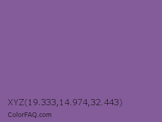 XYZ 19.333,14.974,32.443 Color is a normal purple color and the nearest color is Trendy Pink #8c6495. Hex code #855c9a and RGB value is rgb(133,92,154). In RGB color space, this color is composed of 52% red, 36% green, 60% blue, In CMYK color space, this color is composed of 14% cyan, 40% magenta, 0% yellow , 40% black , In HSL color space, this color has a hue angle of 280° , 25% saturation and 48% lightness.