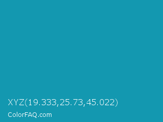 XYZ 19.333,25.73,45.022 Color is a normal cyan color and the nearest color is Eastern Blue #1e9ab0. Hex code #1398b0 and RGB value is rgb(19,152,176). In RGB color space, this color is composed of 7% red, 60% green, 69% blue, In CMYK color space, this color is composed of 89% cyan, 14% magenta, 0% yellow , 31% black , In HSL color space, this color has a hue angle of 189° , 81% saturation and 38% lightness.