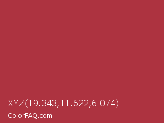 XYZ 19.343,11.622,6.074 Color is a normal red color and the nearest color is Well Read #b43332. Hex code #ad3340 and RGB value is rgb(173,51,64). In RGB color space, this color is composed of 68% red, 20% green, 25% blue, In CMYK color space, this color is composed of 0% cyan, 71% magenta, 63% yellow , 32% black , In HSL color space, this color has a hue angle of 354° , 54% saturation and 44% lightness.