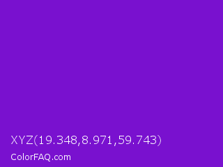 XYZ 19.348,8.971,59.743 Color is a normal purple color and the nearest color is French Violet #8806ce. Hex code #7911cf and RGB value is rgb(121,17,207). In RGB color space, this color is composed of 47% red, 7% green, 81% blue, In CMYK color space, this color is composed of 42% cyan, 92% magenta, 0% yellow , 19% black , In HSL color space, this color has a hue angle of 273° , 85% saturation and 44% lightness.