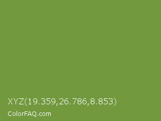 XYZ 19.359,26.786,8.853 Color is a normal green color and the nearest color is Palm Leaf #6f9940. Hex code #73993f and RGB value is rgb(115,153,63). In RGB color space, this color is composed of 45% red, 60% green, 25% blue, In CMYK color space, this color is composed of 25% cyan, 0% magenta, 59% yellow , 40% black , In HSL color space, this color has a hue angle of 85° , 42% saturation and 42% lightness.