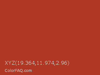 XYZ 19.364,11.974,2.96 Color is a normal red color and the nearest color is Chinese Red #aa381e. Hex code #af3724 and RGB value is rgb(175,55,36). In RGB color space, this color is composed of 69% red, 22% green, 14% blue, In CMYK color space, this color is composed of 0% cyan, 69% magenta, 79% yellow , 31% black , In HSL color space, this color has a hue angle of 8° , 66% saturation and 41% lightness.
