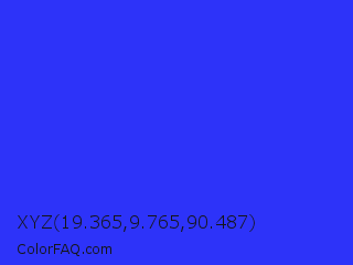 XYZ 19.365,9.765,90.487 Color is a normal blue color and the nearest color is Palatinate Blue #273be2. Hex code #2d33f9 and RGB value is rgb(45,51,249). In RGB color space, this color is composed of 18% red, 20% green, 98% blue, In CMYK color space, this color is composed of 82% cyan, 80% magenta, 0% yellow , 2% black , In HSL color space, this color has a hue angle of 238° , 94% saturation and 58% lightness.