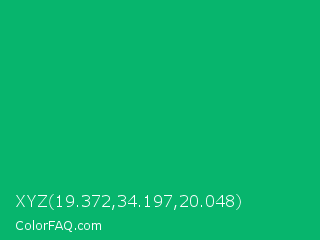 XYZ 19.372,34.197,20.048 Color is a normal green color and the nearest color is GO Green #00ab66. Hex code #07b56d and RGB value is rgb(7,181,109). In RGB color space, this color is composed of 3% red, 71% green, 43% blue, In CMYK color space, this color is composed of 96% cyan, 0% magenta, 40% yellow , 29% black , In HSL color space, this color has a hue angle of 155° , 93% saturation and 37% lightness.
