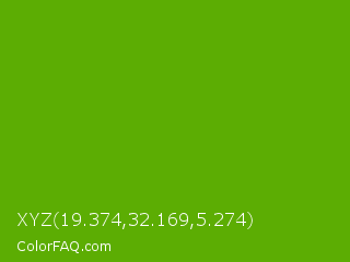XYZ 19.374,32.169,5.274 Color is a normal green color and the nearest color is Christi #67a712. Hex code #5cad03 and RGB value is rgb(92,173,3). In RGB color space, this color is composed of 36% red, 68% green, 1% blue, In CMYK color space, this color is composed of 47% cyan, 0% magenta, 98% yellow , 32% black , In HSL color space, this color has a hue angle of 89° , 97% saturation and 35% lightness.