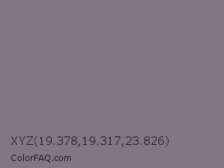 XYZ 19.378,19.317,23.826 Color is a normal purple color and the nearest color is Jumbo #7c7b82. Hex code #7f7782 and RGB value is rgb(127,119,130). In RGB color space, this color is composed of 50% red, 47% green, 51% blue, In CMYK color space, this color is composed of 2% cyan, 8% magenta, 0% yellow , 49% black , In HSL color space, this color has a hue angle of 284° , 4% saturation and 49% lightness.