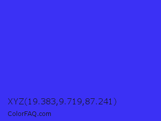 XYZ 19.383,9.719,87.241 Color is a normal indigo color and the nearest color is Palatinate Blue #273be2. Hex code #3b31f5 and RGB value is rgb(59,49,245). In RGB color space, this color is composed of 23% red, 19% green, 96% blue, In CMYK color space, this color is composed of 76% cyan, 80% magenta, 0% yellow , 4% black , In HSL color space, this color has a hue angle of 243° , 91% saturation and 58% lightness.