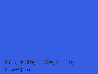 XYZ 19.389,14.336,74.418 Color is a normal blue color and the nearest color is Royal Blue #4169e1. Hex code #365ee3 and RGB value is rgb(54,94,227). In RGB color space, this color is composed of 21% red, 37% green, 89% blue, In CMYK color space, this color is composed of 76% cyan, 59% magenta, 0% yellow , 11% black , In HSL color space, this color has a hue angle of 226° , 76% saturation and 55% lightness.