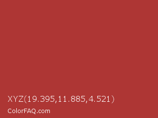 XYZ 19.395,11.885,4.521 Color is a normal red color and the nearest color is Sweet Brown #a83731. Hex code #ae3634 and RGB value is rgb(174,54,52). In RGB color space, this color is composed of 68% red, 21% green, 20% blue, In CMYK color space, this color is composed of 0% cyan, 69% magenta, 70% yellow , 32% black , In HSL color space, this color has a hue angle of 1° , 54% saturation and 44% lightness.