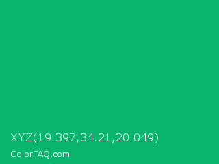 XYZ 19.397,34.21,20.049 Color is a normal green color and the nearest color is GO Green #00ab66. Hex code #09b56d and RGB value is rgb(9,181,109). In RGB color space, this color is composed of 4% red, 71% green, 43% blue, In CMYK color space, this color is composed of 95% cyan, 0% magenta, 40% yellow , 29% black , In HSL color space, this color has a hue angle of 155° , 91% saturation and 37% lightness.