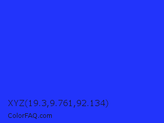 XYZ 19.3,9.761,92.134 Color is a normal blue color and the nearest color is Palatinate Blue #273be2. Hex code #2234fb and RGB value is rgb(34,52,251). In RGB color space, this color is composed of 13% red, 20% green, 98% blue, In CMYK color space, this color is composed of 86% cyan, 79% magenta, 0% yellow , 2% black , In HSL color space, this color has a hue angle of 235° , 96% saturation and 56% lightness.