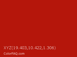 XYZ 19.403,10.422,1.306 Color is a normal red color and the nearest color is International Orange Engineering #ba160c. Hex code #b5160b and RGB value is rgb(181,22,11). In RGB color space, this color is composed of 71% red, 9% green, 4% blue, In CMYK color space, this color is composed of 0% cyan, 88% magenta, 94% yellow , 29% black , In HSL color space, this color has a hue angle of 4° , 89% saturation and 38% lightness.