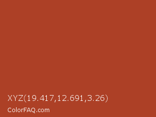 XYZ 19.417,12.691,3.26 Color is a normal red color and the nearest color is Chinese Red #aa381e. Hex code #ad4026 and RGB value is rgb(173,64,38). In RGB color space, this color is composed of 68% red, 25% green, 15% blue, In CMYK color space, this color is composed of 0% cyan, 63% magenta, 78% yellow , 32% black , In HSL color space, this color has a hue angle of 12° , 64% saturation and 41% lightness.