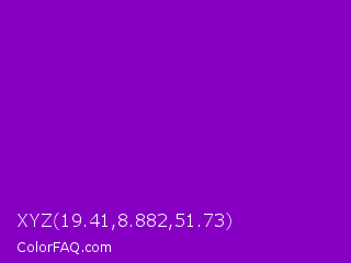 XYZ 19.41,8.882,51.73 Color is a normal purple color and the nearest color is French Violet #8806ce. Hex code #8500c2 and RGB value is rgb(133,0,194). In RGB color space, this color is composed of 52% red, 0% green, 76% blue, In CMYK color space, this color is composed of 31% cyan, 100% magenta, 0% yellow , 24% black , In HSL color space, this color has a hue angle of 281° , 100% saturation and 38% lightness.
