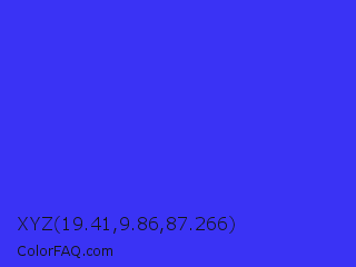XYZ 19.41,9.86,87.266 Color is a normal indigo color and the nearest color is Palatinate Blue #273be2. Hex code #3a33f5 and RGB value is rgb(58,51,245). In RGB color space, this color is composed of 23% red, 20% green, 96% blue, In CMYK color space, this color is composed of 76% cyan, 79% magenta, 0% yellow , 4% black , In HSL color space, this color has a hue angle of 242° , 91% saturation and 58% lightness.